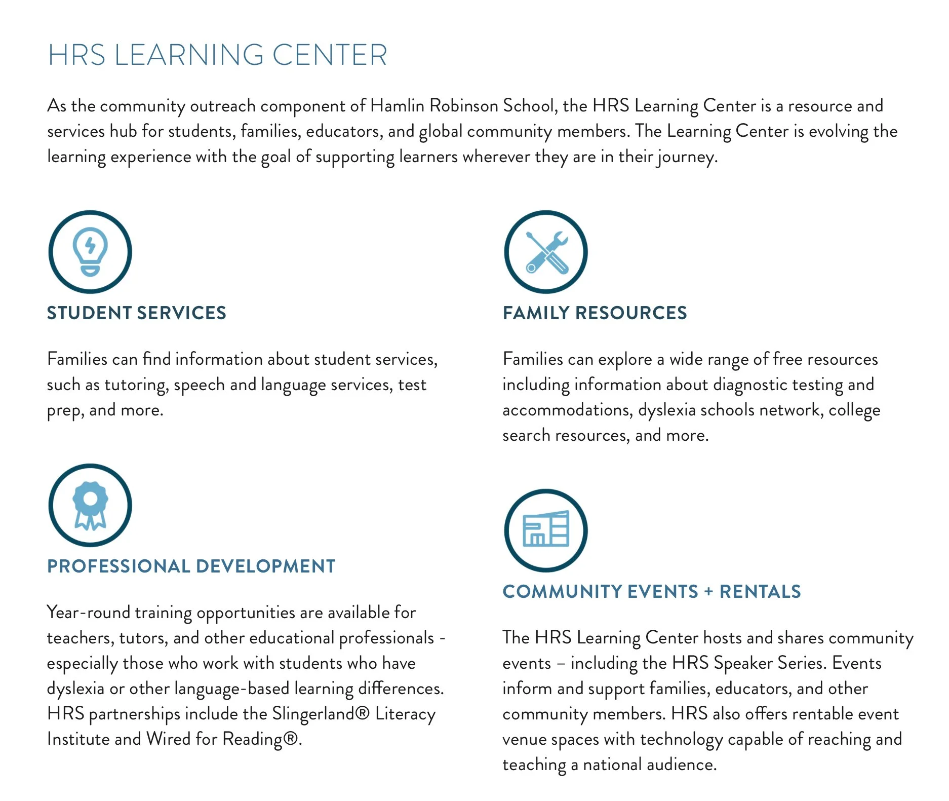 An overview of the Hamlin Robinson School Learning Center goals and services for the local and national dyslexia community.