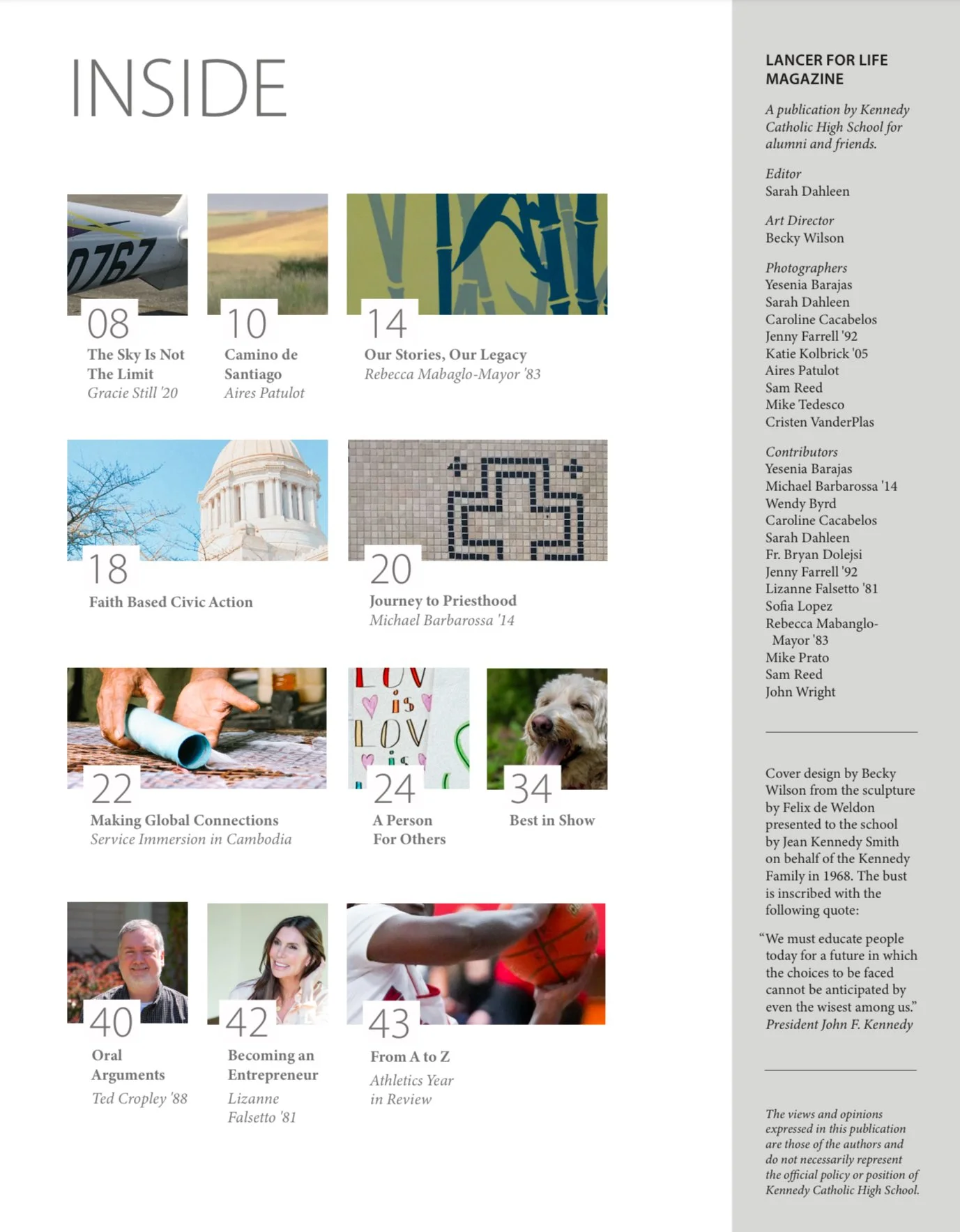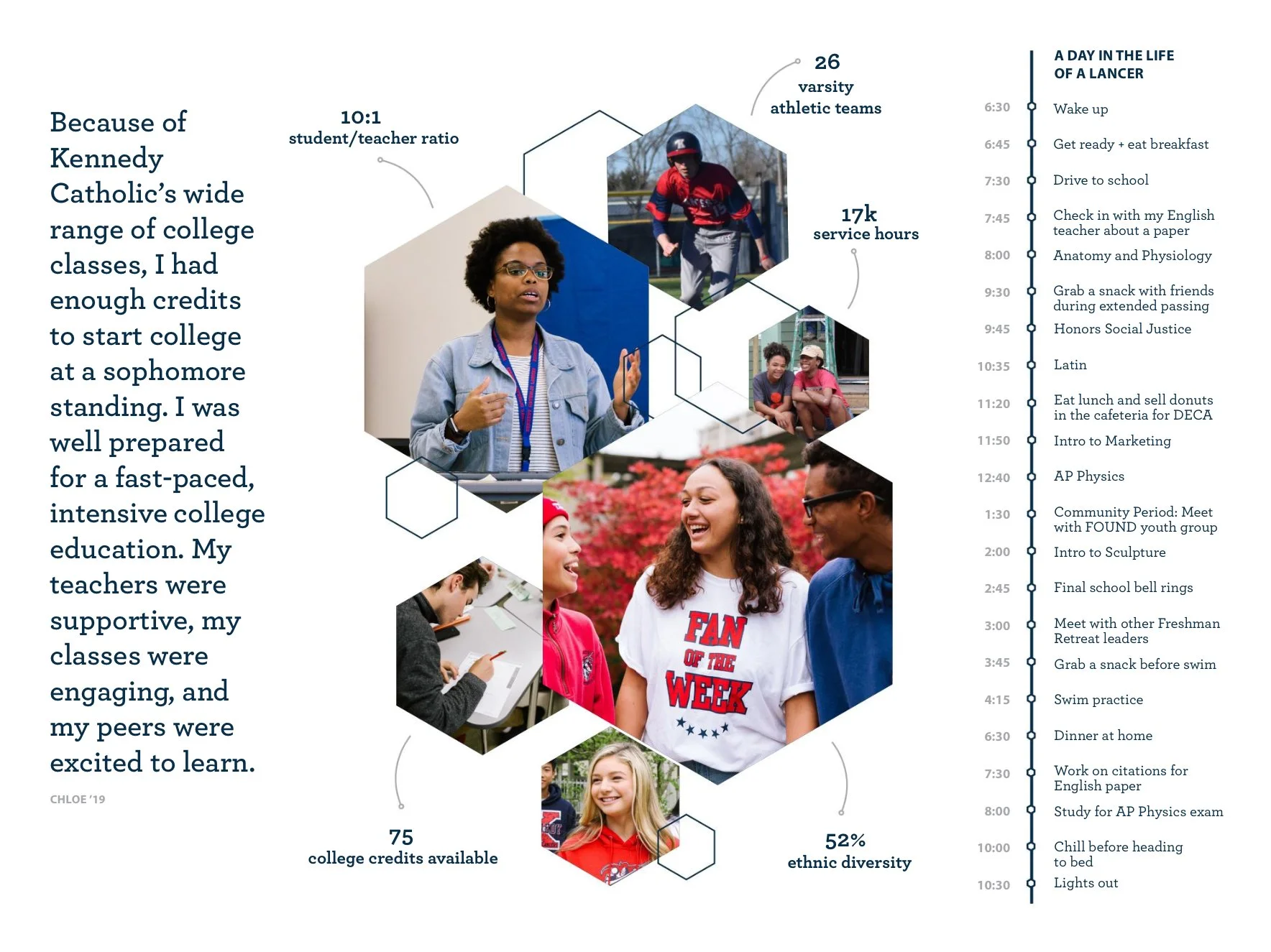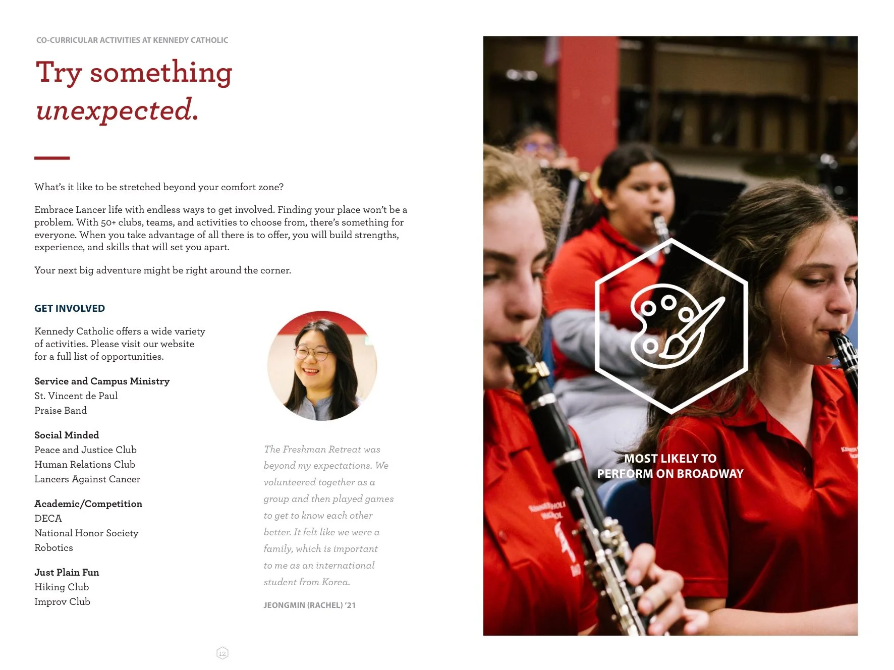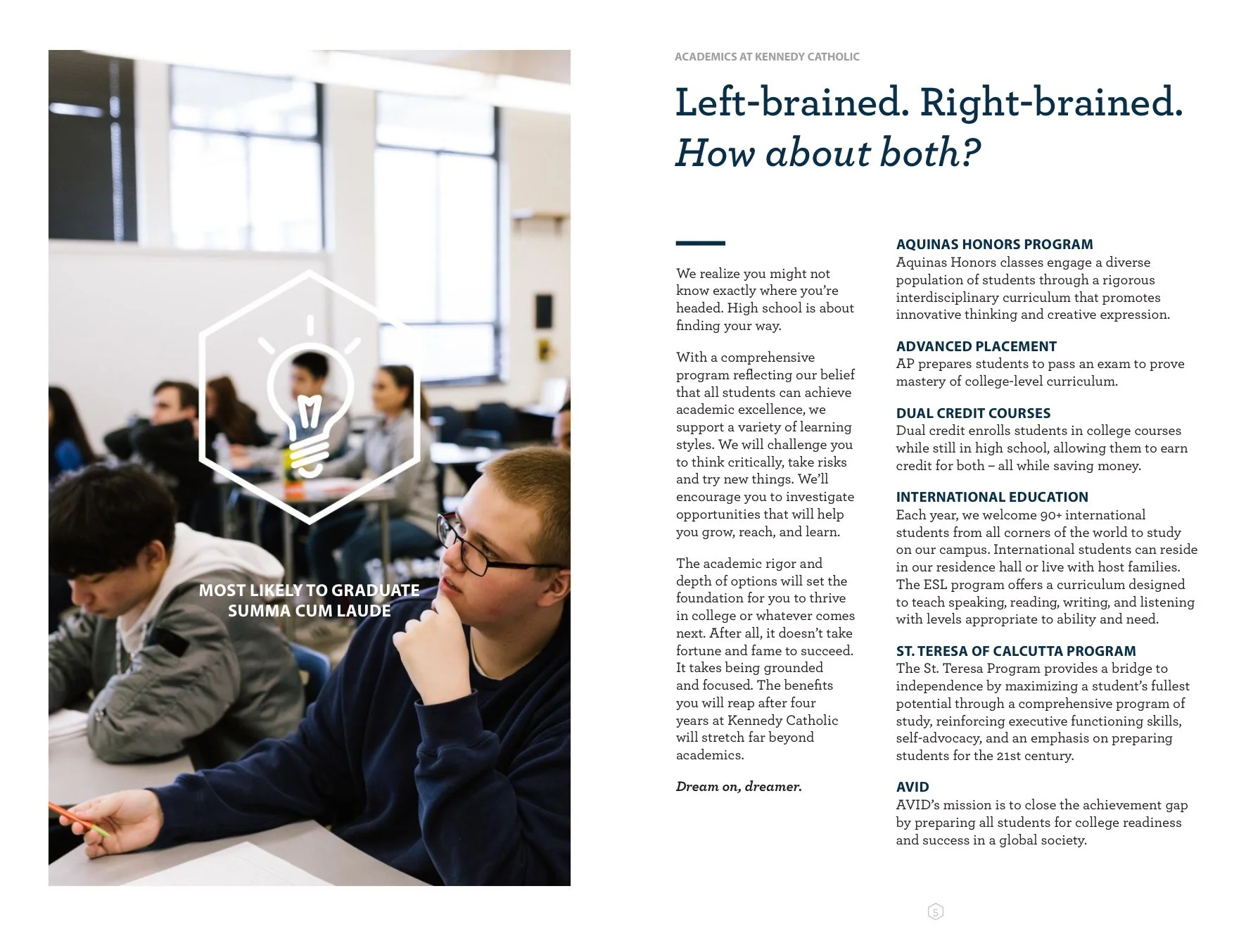 This admissions brochure was designed to share more about the academic program at Kennedy Catholic High School. Becky was given content and sections the department wanted to highlight, and created an icon system to match the theme and visually guide readers through the brochure. This project also required strategic use of hierarchy in order to clearly communicate dense information.